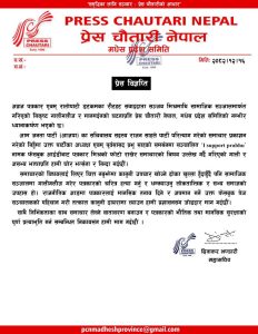 प्रेस चौतारी नेपाल मधेस प्रदेशका महासचिव दिवाकर भण्डारीद्वारा जारी विज्ञप्तिमा भनिएको छ ‘समाचारको विषयलाई लिएर चित्त नबुझेमा कानुनी उपचार खोज्ने ढोका खुल्ला हुँदाहुँदै पनि सामाजिक सञ्जालमा गालीगलौज गरेर पत्रकारको चरित्र हत्या गर्नु र धम्क्याउनु लोकतान्त्रिक र सभ्य समाजको उपहास हो ।