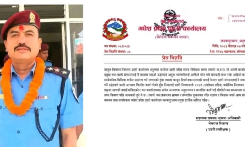 बारा – मधेश प्रदेश प्रहरी कार्यालय जनकपुरधामले जिल्ला प्रहरी कार्यालय धनुषामा कार्यरत प्रहरी वरिष्ठ नायव निरीक्षक सागर शमसेर जबरा माथि बनावटी अडियो तयार गरी कार्यालय प्रमुख तथा अरु प्रहरी संगठनलाई बदनाम गराउने प्रयास गरेको आरोपमा जबराको  निलम्बन प्रक्रिया अगाडि बढाएको छ।